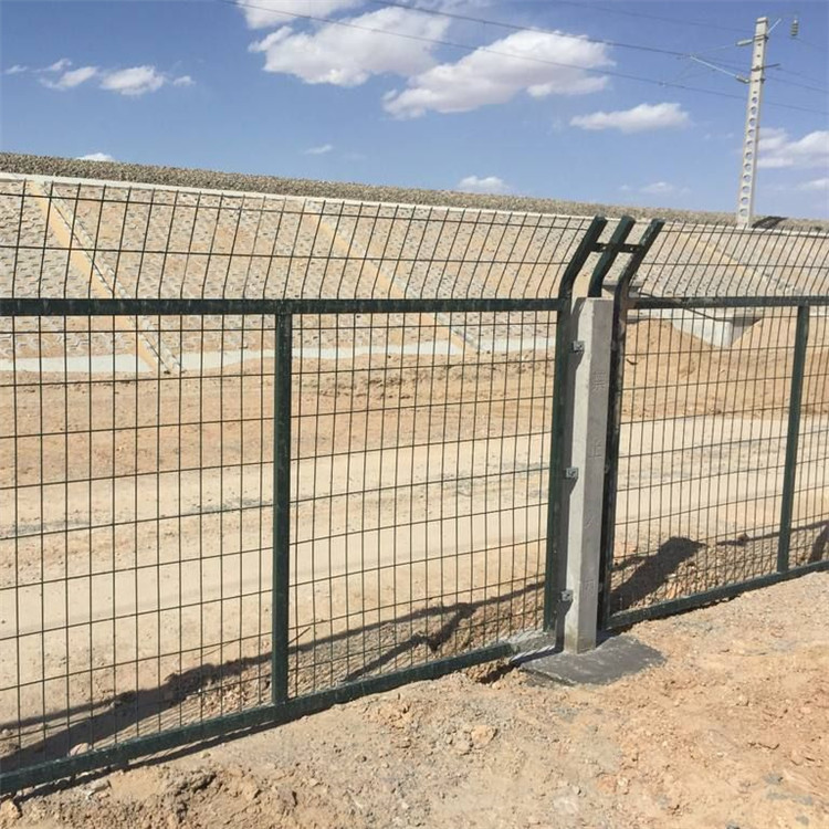 在高壓輸電線穿過安裝鐵路防護柵欄的地方, 防護柵欄應按電力部的規定接上地線。立柱的埋設應分段進行,先埋兩端的立柱,然后拉線埋設中間立柱。從縱向看,立柱的軸線應在一條直線上,不得出現參差不齊的現象從高度看,柱頂應平順,不得出現高低不平的情況。尺寸和型號符合要求的鐵路防護柵欄網片,應按圖紙規定的方式從立柱端部開始牢固安裝到立柱的掛鉤上或將網片安裝在鐵路內,鐵路與立柱連接應牢固。所有的網片及鐵絲均應繃緊而不變形,其安裝高度應符合圖紙規定。防護柵欄安裝完畢,立柱基礎均需進行后壓實處理。